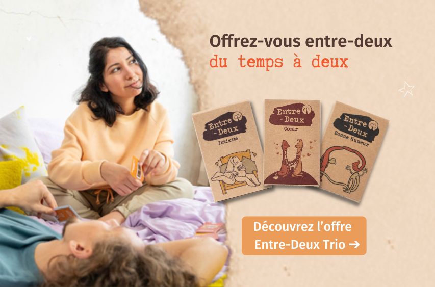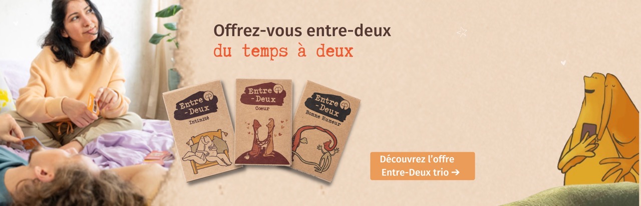 Chaque jeu Entre-Deux se compose de 53 échanges spontanés à découvrir en couple pour échanger un autre regard, parler à l’unisson, ouvrir votre cœur ou encore voyager dans le temps… Partagez de nouvelles conversations dans votre couple. Dans votre canapé, on vous souhaite un bon moment à deux. Cliquez sur les flèches ci-dessous pour voir ce qui vous attend.