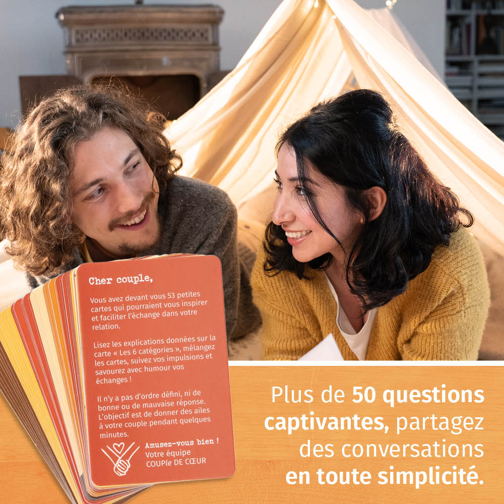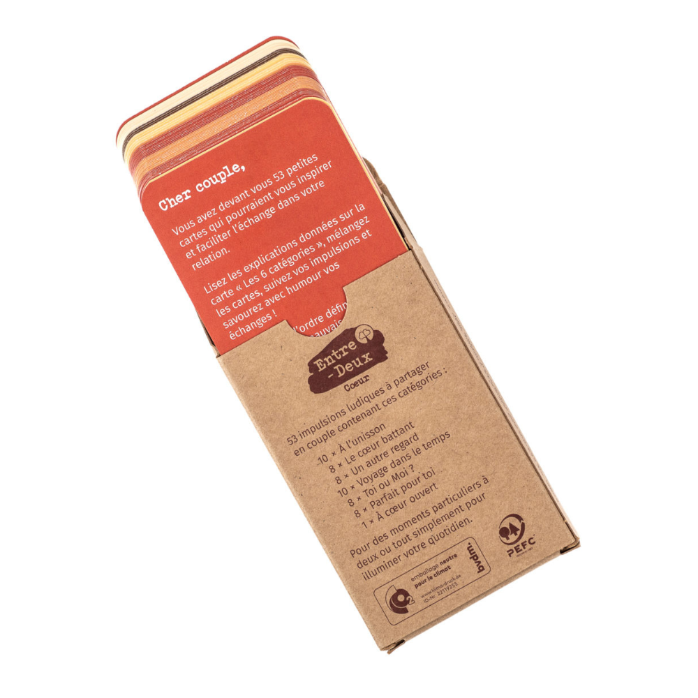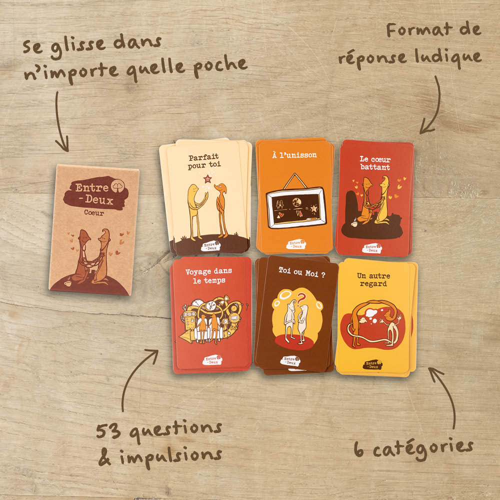 Le jeu de cartes Entre-Deux Cœur invite à partager des échanges spontanés en lien avec votre relation de couple. Le temps passé ensemble et l’estime mutuelle passent souvent inaperçus dans la vie trépidante du quotidien.
